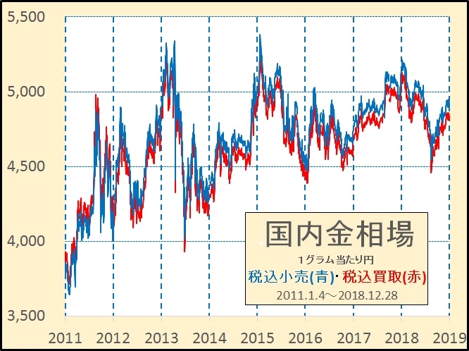<2018年> 年明け4日は、海外相場の1300ドル回復を受け税込買取価格は5,073円でスタート、続伸して9日には12月29日比99円高の5,127円と一段高。10日には49円の反落となりました。その後1月末にかけ軟調となりましたが、2月2日には5,072円と反発し高値水準を維持しました。5日以降は海外相場の軟調を受け円高傾向も追い打ちをかけ続落、7日に5,000円を割り、3月に入りと昨年12月の安値を下回り4,800円台主流で、19日には4,792円と昨年8月9日以来の安値となりました。これを安値に反発、4月も続伸し4,900円を突破、円安の支援もあり19日には4,990円と5,000円の大台に急接近しました。2月7日以来2カ月半ぶりの水準を回復。5月は前半は価格を維持していたものの後半は小安い展開、円高が響いた恰好。6月は前半は小ジッカリ推移していましたが15日のNY金相場の下落を映して18日に15日比77円安を記録、26日には4,779円まで続落して今年の安値を更新。29日には4,749円と1年3ヶ月ぶりの安値に落ち込みました。7月に入り反転、円安を映し13日には4,837円と安値から88円の上昇となりました。その後は海外相場安と円高から再び軟調に推移、31日には4,680円と昨年1月31日の4,677円以来1年半ぶりの安値を記録しました。8月に入っても相場は軟弱、中旬にかけさらに一段安となり、16日には4,458円と2016年1月22日以来2年7か月ぶりの安値へ沈みました。その後は海外相場の反発と小幅ながらの円安で23日には安値から100円程の反発となりました。27日は前週末の海外相場の反発を受け78円高となりました。その後は4,600円前後の動きから9月21日には4,680円まで回復しました。10月に入り3日には海外相場の1200ドル回復を映し前日比53円高の4,725円に上昇、7月20日以来の高値を回復しました。しかし8日の海外相場の下落、対ユーロでのドル高にも拘わらず逆に円高に振れ9日には国内金は5日比で66円安の4,636円に下落しました。12日には97円の急反発、世界同時株安を受けたNY金相場高を映したもの。10月16日に4,729円、24日に4,765円まで上昇、3か月ぶりの水準を回復しました。さらに11月5日には4,812円と7月13日以来の高値を回復しました。しかし11月12日、13日と下落し高値から100円強の反落となりました。その後12月にかけては堅調で、12月6日には最近の高値である11月5日の4,812円を上回り7月13日の4,837円以来5か月ぶりの高値を回復しました。さらに12月14日には4,857円と6月19日以来半年ぶりの高値を回復しました。12月28日に4,860円と6月中旬以来の高値を回復して越年しました。