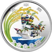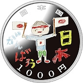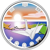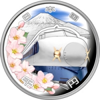写真は額面1000円のカラー銀貨で、0系(ゼロ系)新幹線と富士山と桜をデザイン、裏面は0系新幹線の正面図案(虹色発色加工)を配したもの。純銀製で直径40mm、重量31.1g、発行枚数は5万枚。