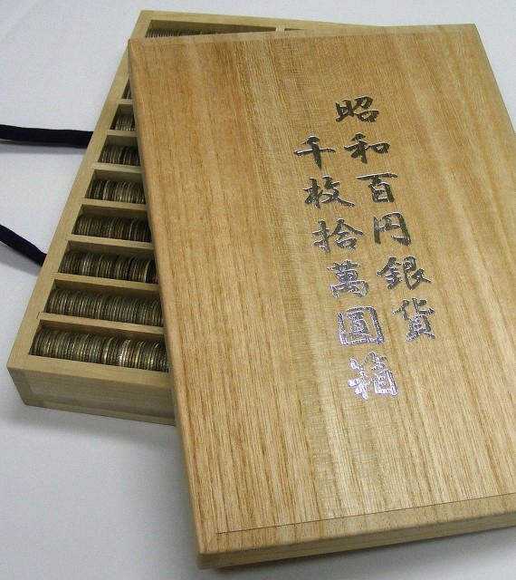 「昭和百円銀貨千枚拾萬圓箱」はこのホームページ内でご案内しておりますが、数量限定で特別販売致します。100円銀貨1000枚の販売価格132万円(税込,2026.2.3 改定)、特製の桐箱に入れてお届け致します。送料弊社負担。※銀相場の変動で価格は上下します。